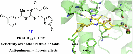 PDE1是PDE超家族的一个亚家族,在许多疾病的病理生理中扮演重要角色,可作为心血管疾病、肺纤维化等疾病的潜在药物靶点,开发高活性高选择性PDE1抑制剂将为肺纤维化等疾病提供一种有前景的治疗策略。然而目前选择性PDE1抑制剂相对较少,往往对其他PDEs的选择性低,从而易引起副作用。因此,发现具有不同结构的PDE1抑制剂并研究它们与PDE1蛋白的识别机制对高选择性PDE1抑制剂的开发至关重要。